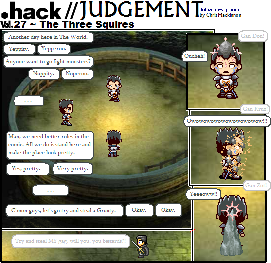 Three identical characters droll on about their boredom, then get PKed for infringement.